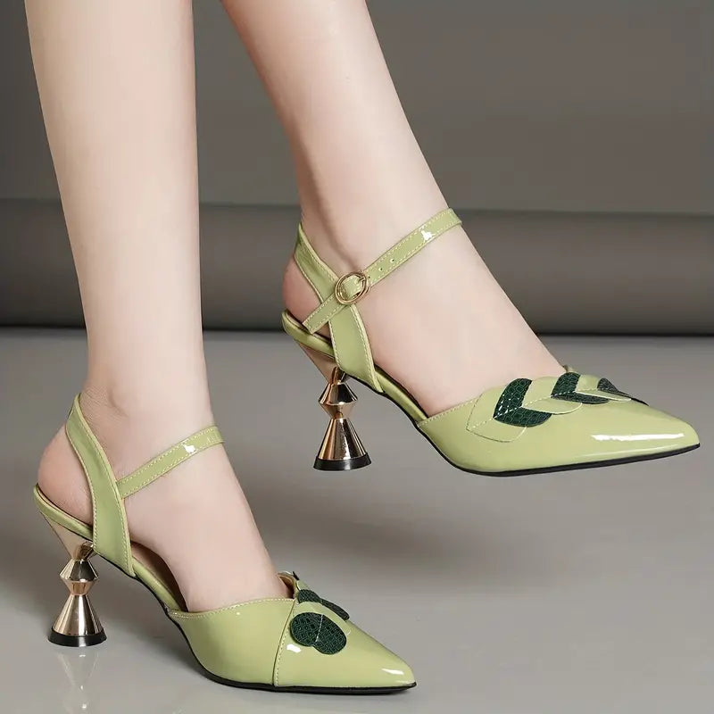 Salto alto feminino com decoração de folhas, sandálias de estilingue com tira no tornozelo e bico fino