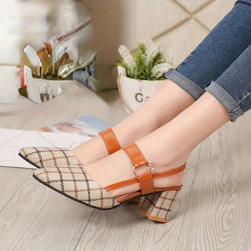 Sandálias femininas com padrão xadrez, sapatos de salto grosso com tira de fivela no tornozelo