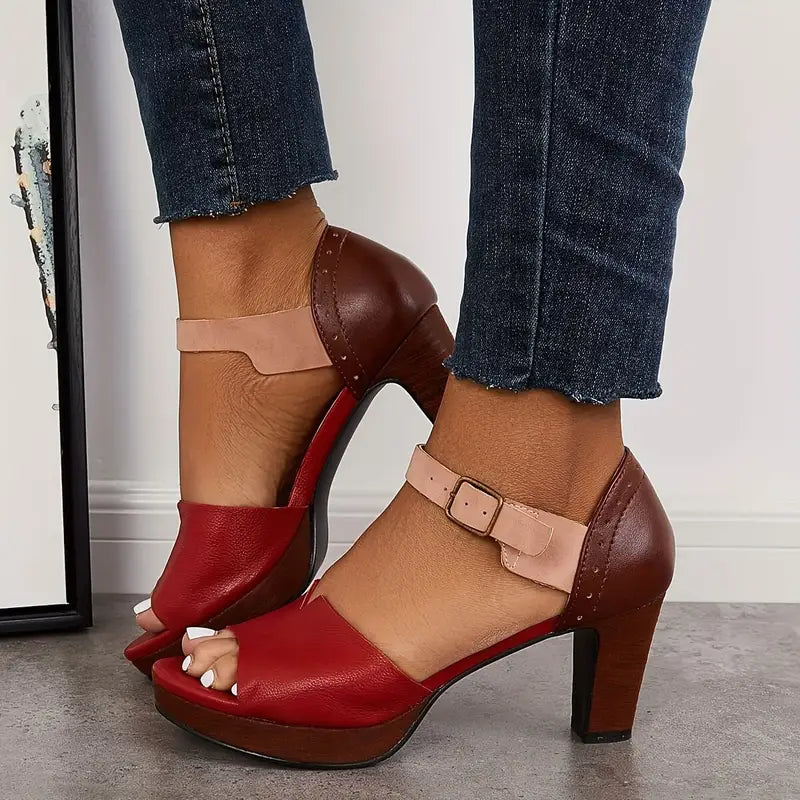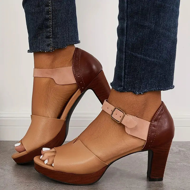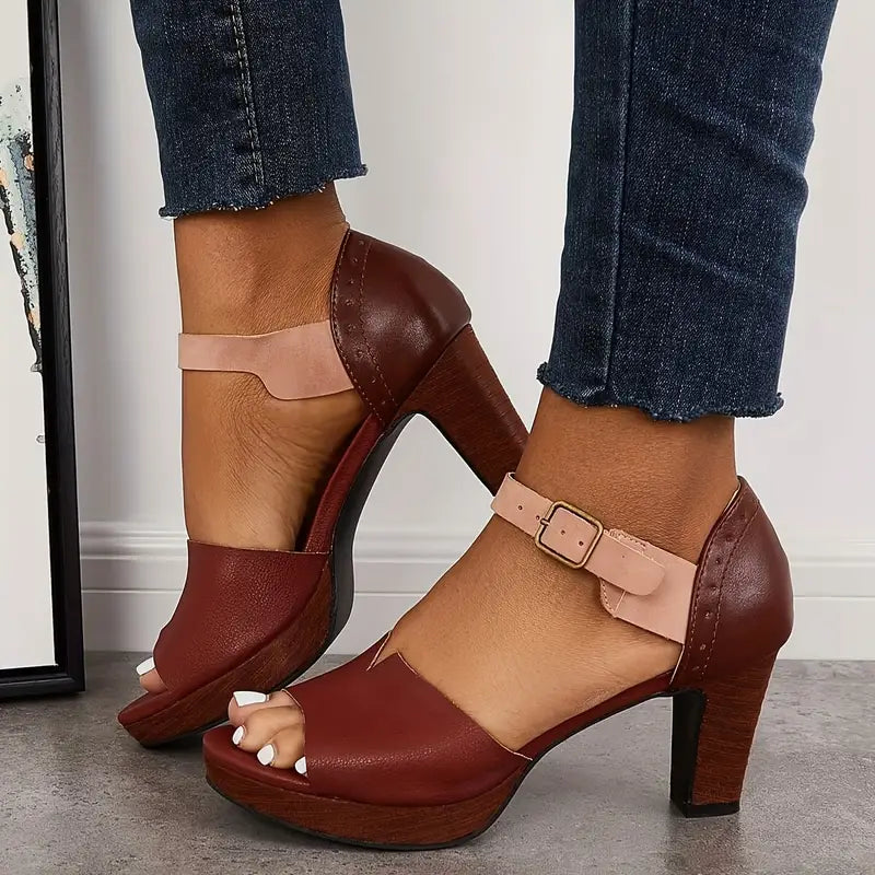 Sandálias femininas com tira de fivela, bico aberto, salto grosso