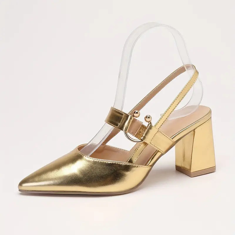 Sandálias femininas de salto alto bloco estilingue, bico fino dourado