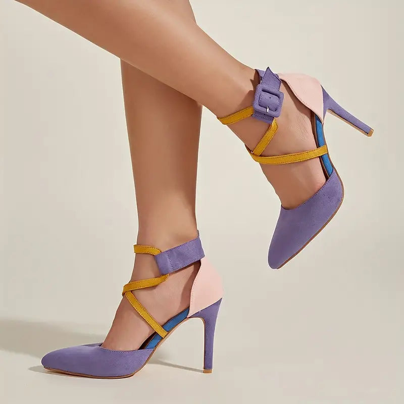 Sandálias femininas de salto alto colorblock, salto agulha elegante com bico fino e alça cruzada