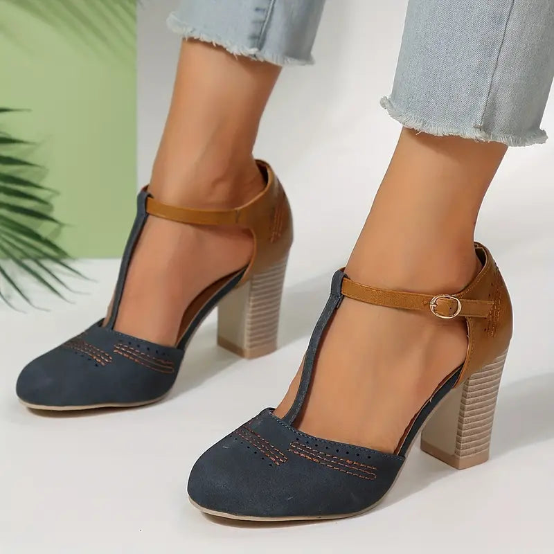Sandálias femininas grossas de salto alto, sapatos coloridos com fivela no tornozelo e tira em T