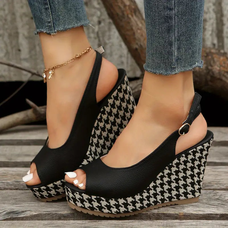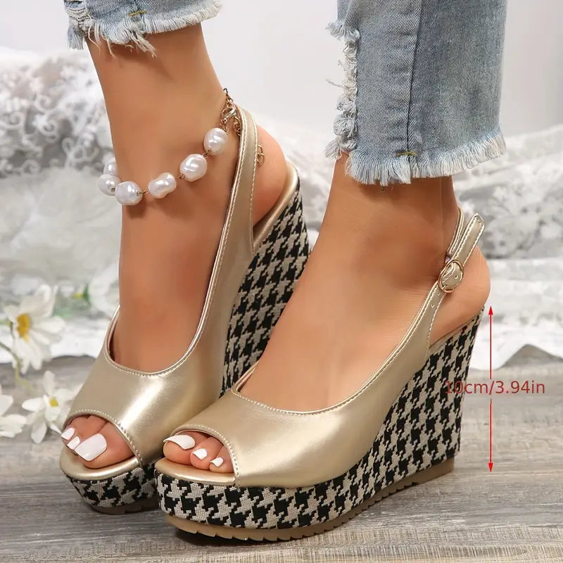 Sandálias plataforma Houndstooth com fivela de cor sólida e tira no tornozelo