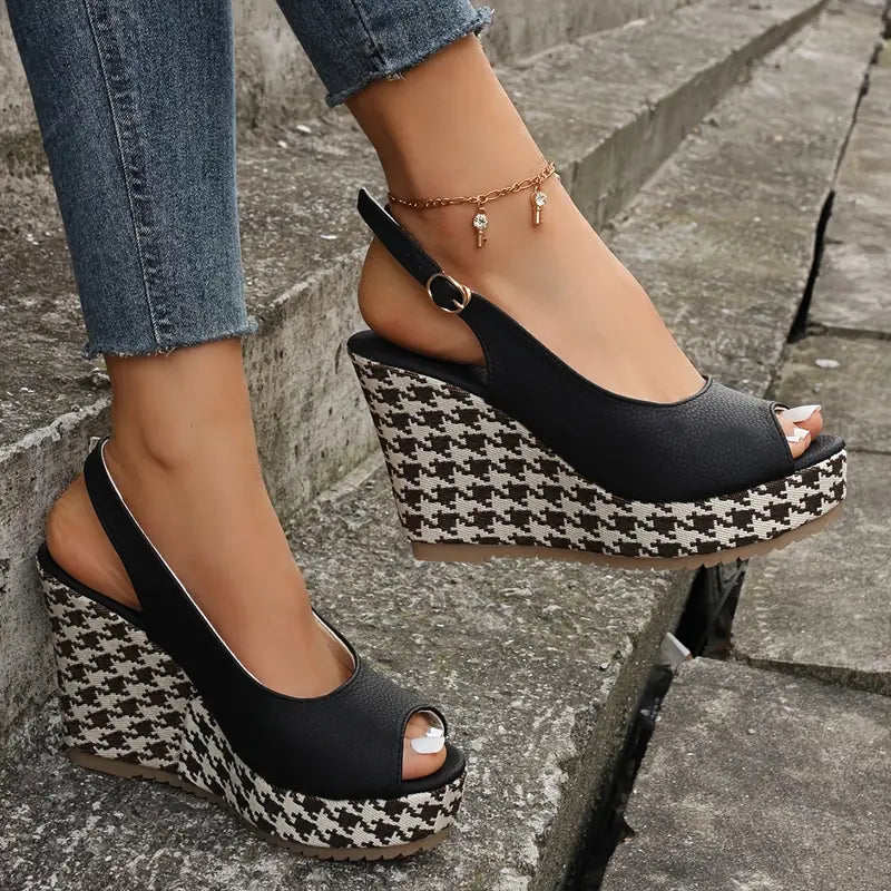 Sandálias plataforma Houndstooth femininas com fivela de cor sólida e tira no tornozelo