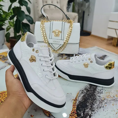Olá, nosso contacto: 84-7374872; 84 382 205; 87 434 1611; Produto: Sapatilhas e Bolsa combinada VERSACE