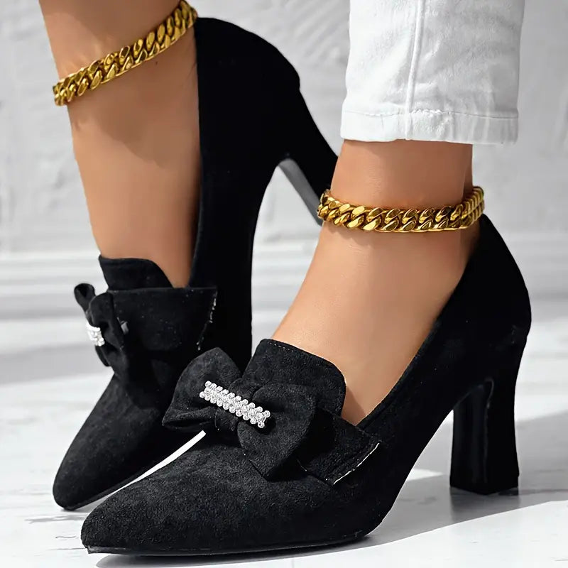 Produto: Sapatos de salto alto femininas com estampa de chita e decoração com laço de strass