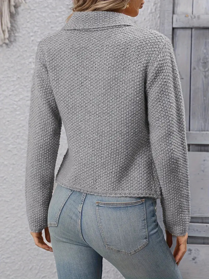 Suéter feminino chique de malha com gola polo sólida , manga comprida, botão frontal