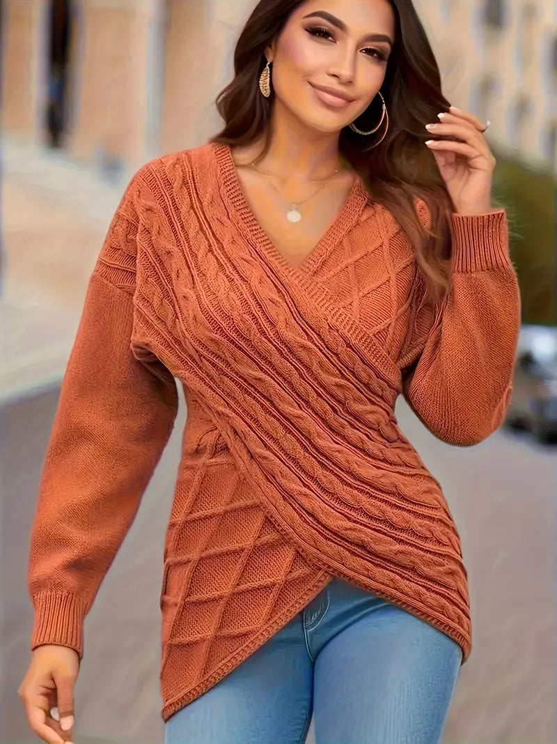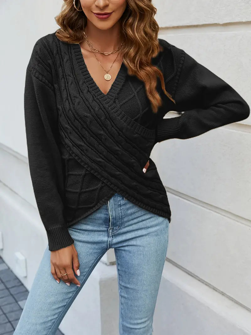 Suéter frontal cruzado com gola sobrepeliz sólida, suéter boho de manga comprida com ombro caído