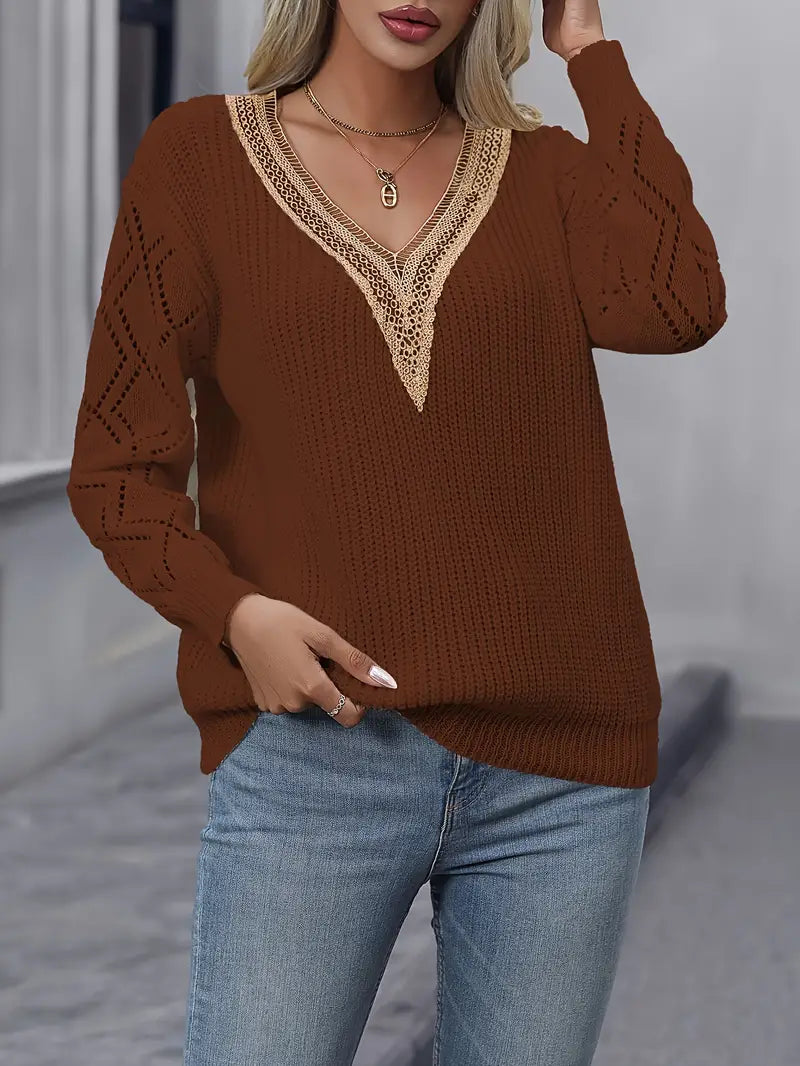 Suéter vibrante sólido com decote em V e ombro caído – Top casual elegante de manga comprida para mulheres