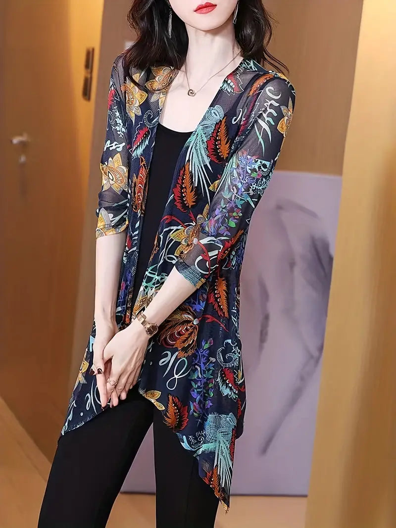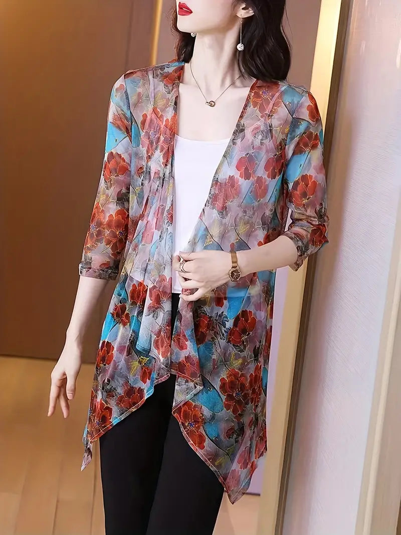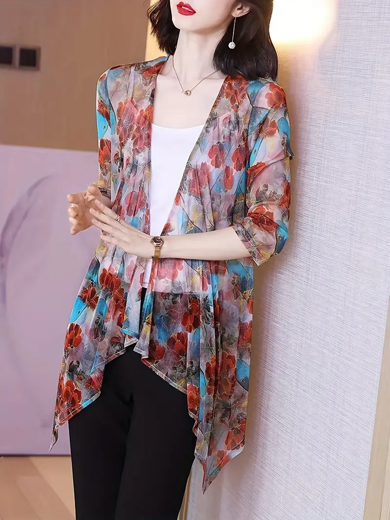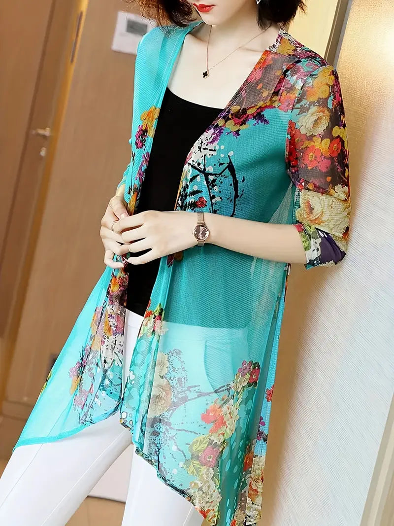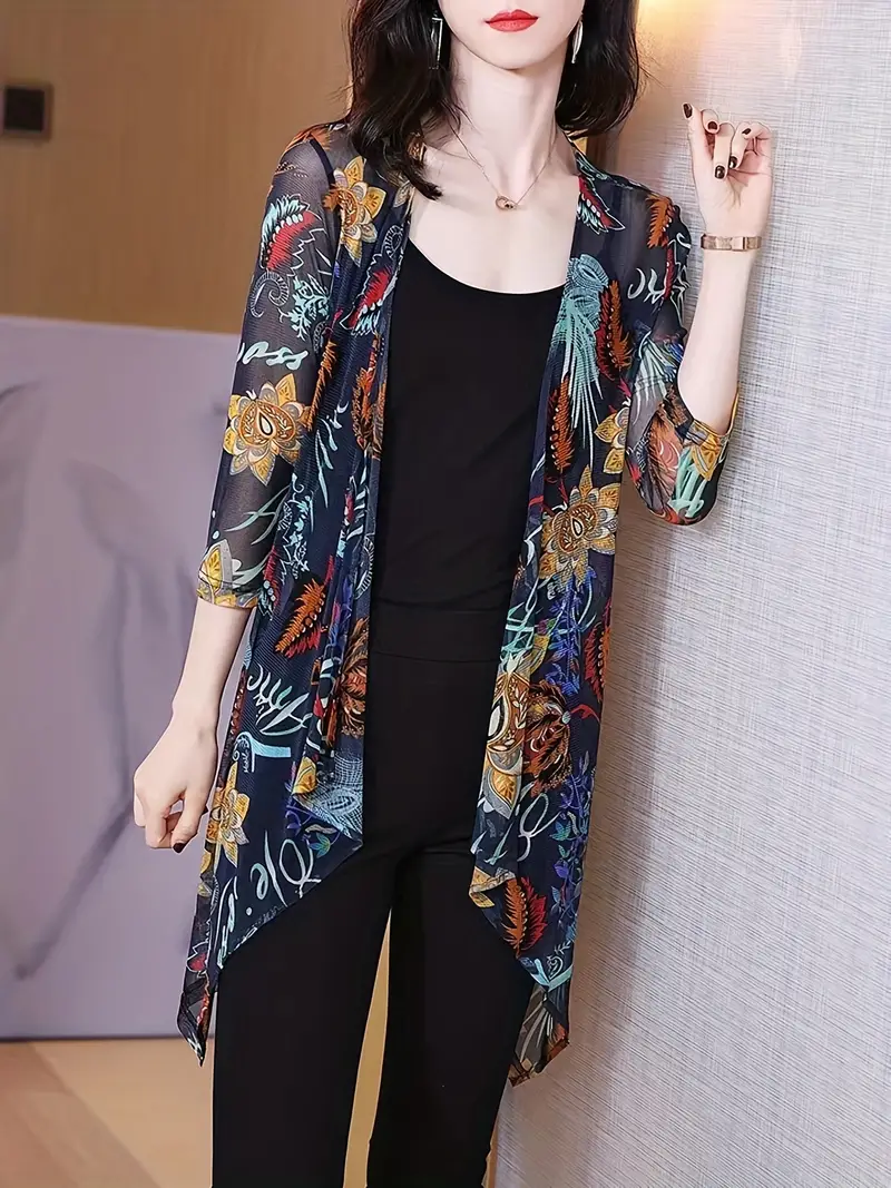 Túnicas com estampa floral na frente aberta, túnicas leves Boho com manga 3/4