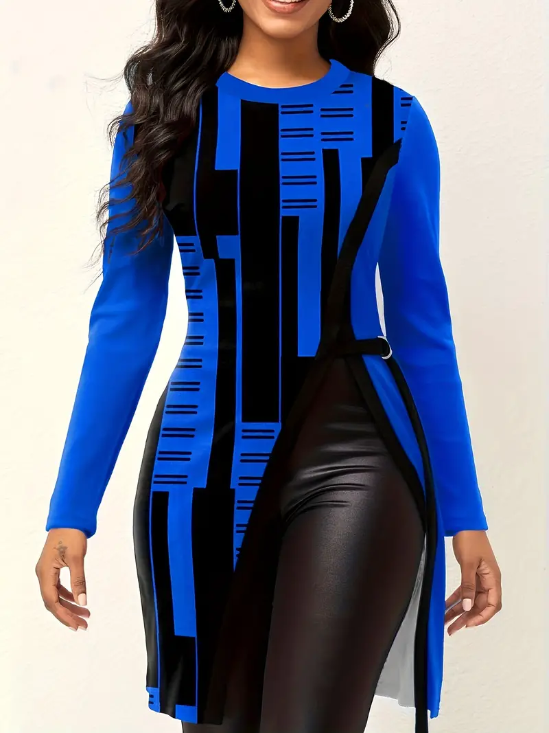Túnicas divididas com estampa geométrica, túnica casual de manga comprida com gola redonda