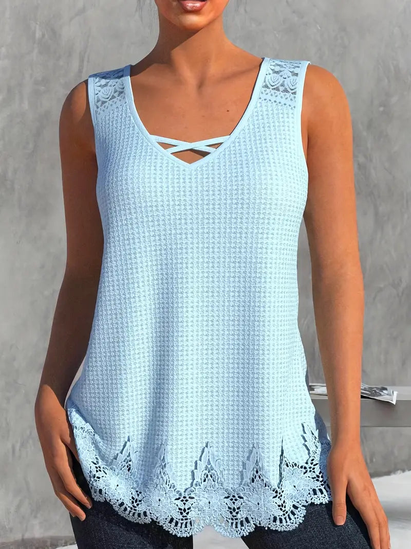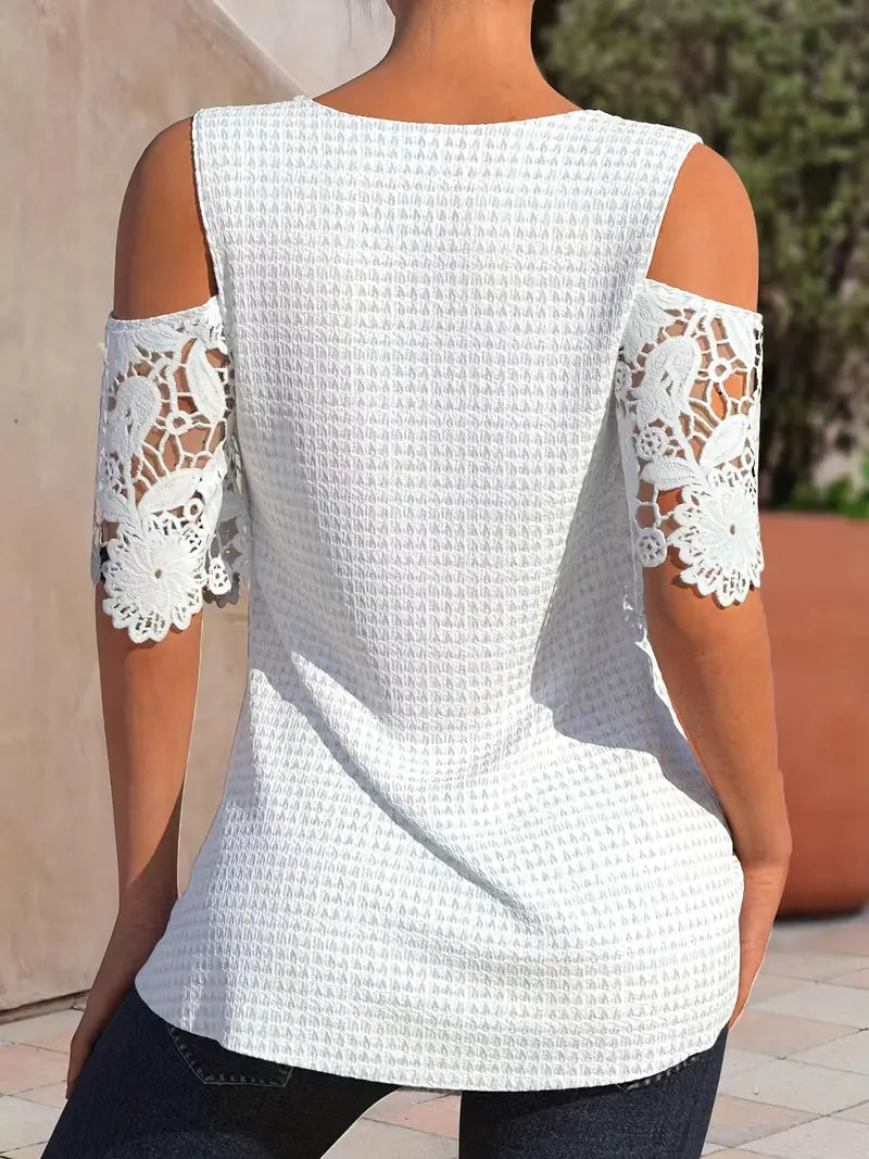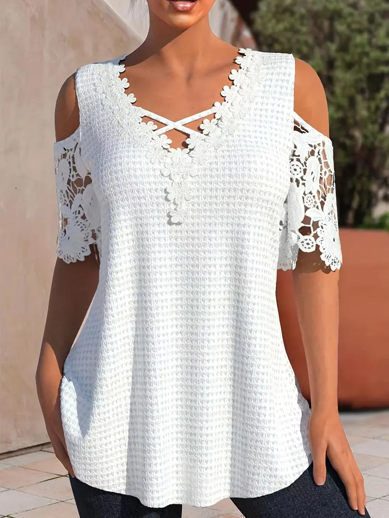 Túnicas sólidas com emenda de renda com ombro frio e decote em V