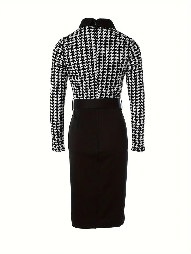 Vestido bodycon com estampa Houndstooth, vestido midi elegante de manga comprida,