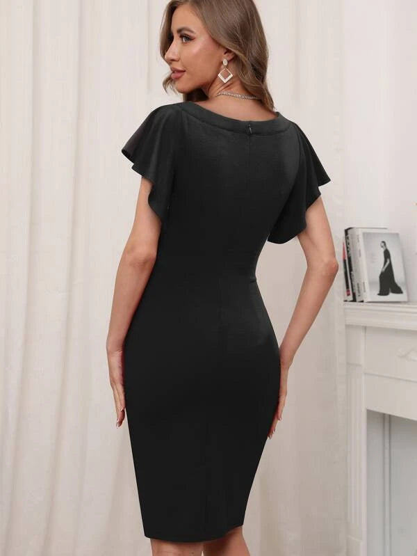 Vestido lápis com folhos e sem mangas para cocktail ou trabalho