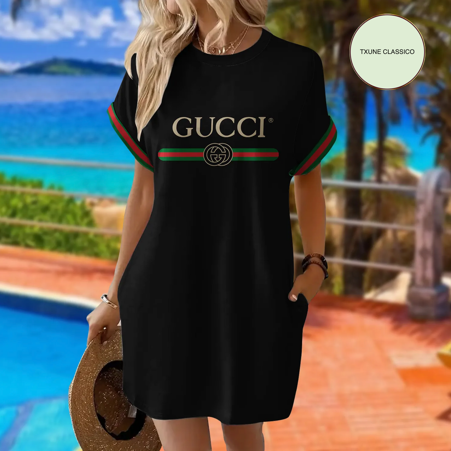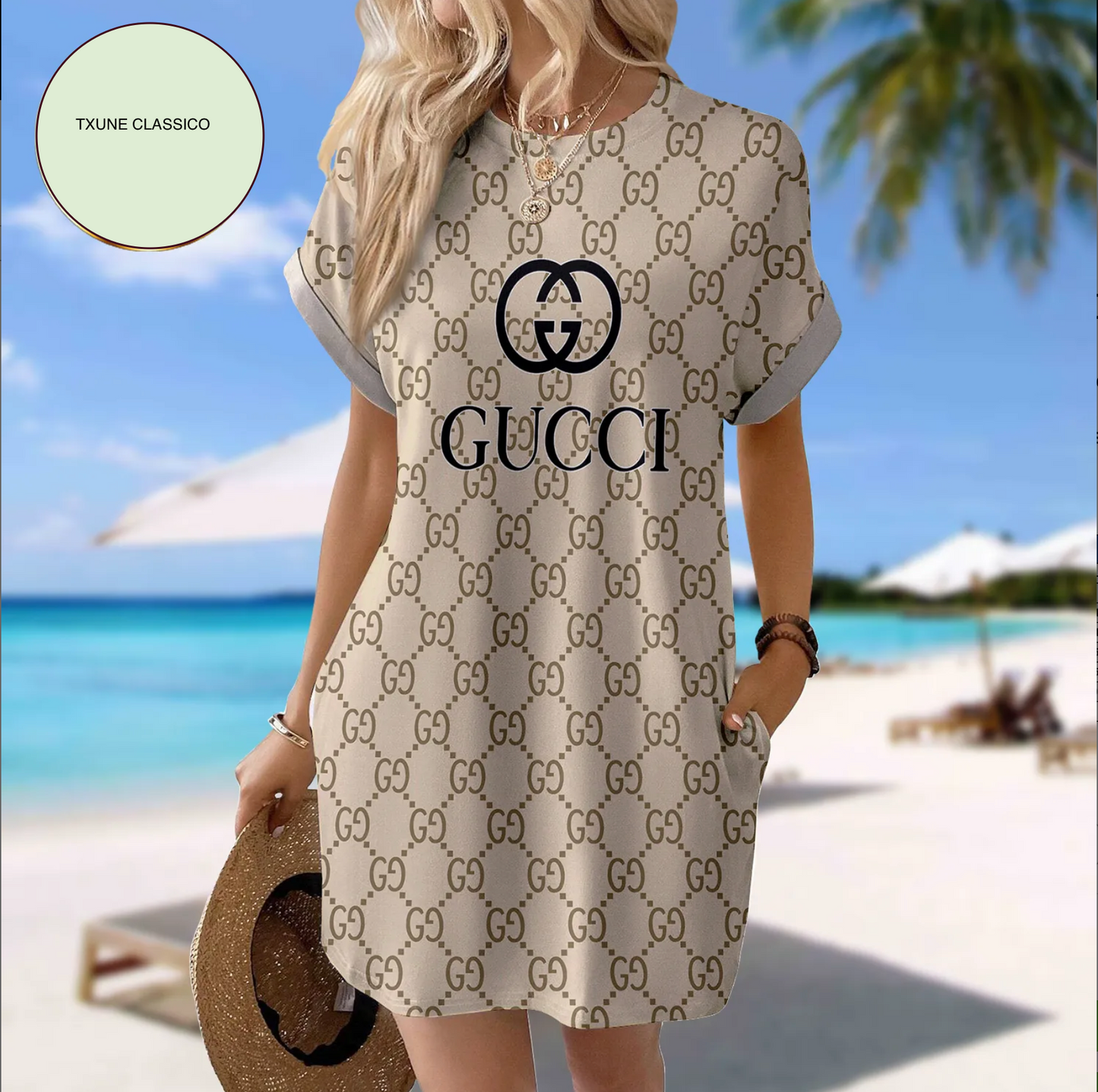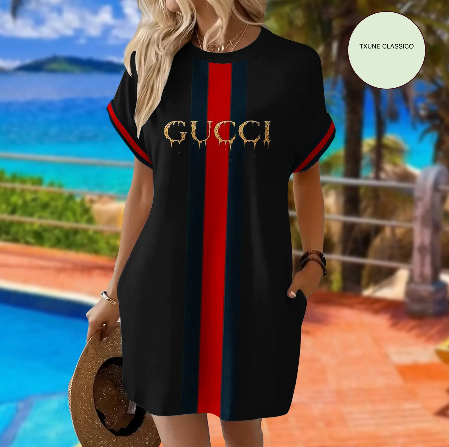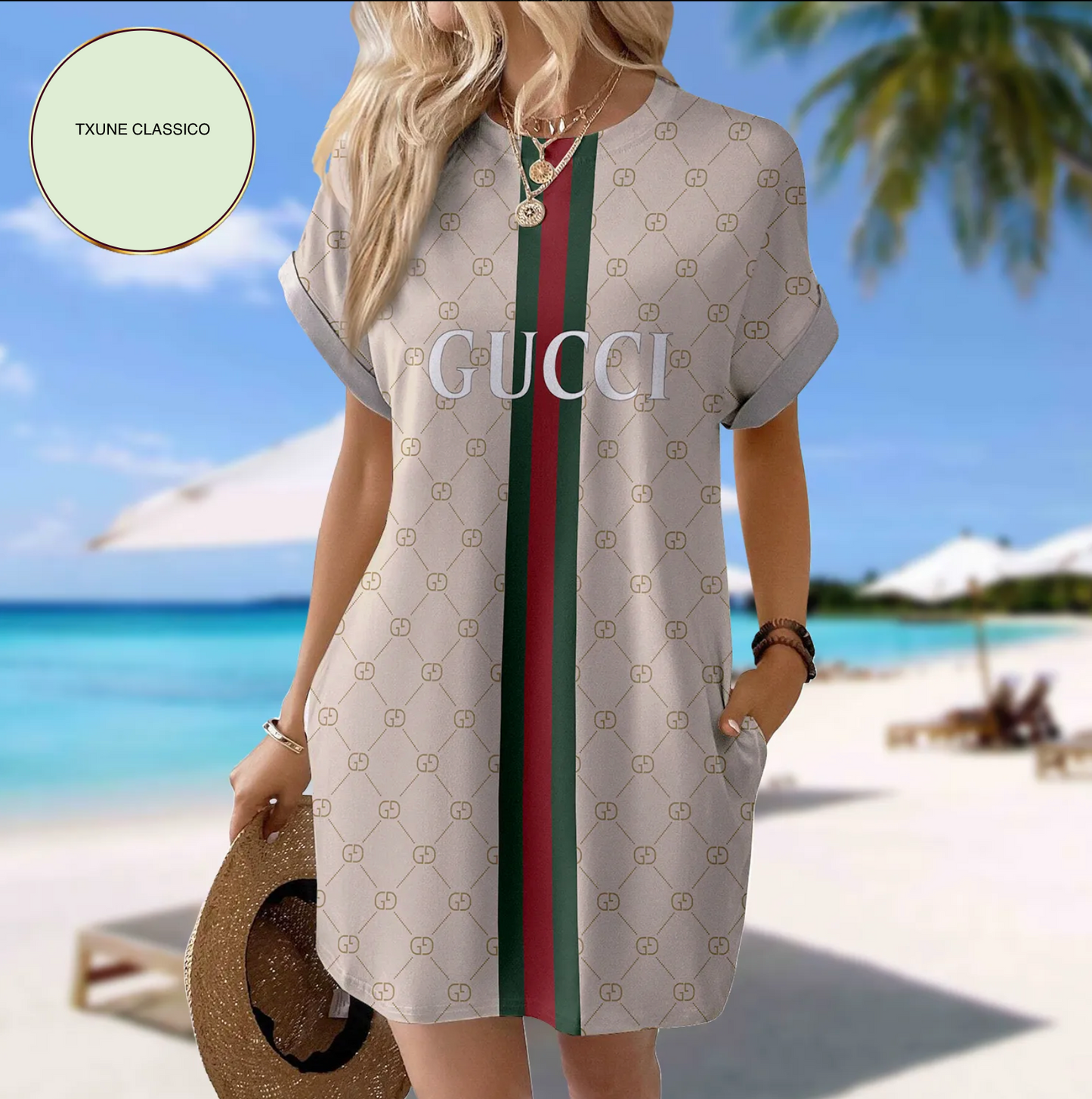 Olá, nosso contacto: 84-7374872; 84 382 205; 87 434 1611; Produto: Vestido com bolsos de Manga Curta GUCCI Material: 95% Poliéster, 5% Spandex Tamanhos: S, M, L, XL , XXL