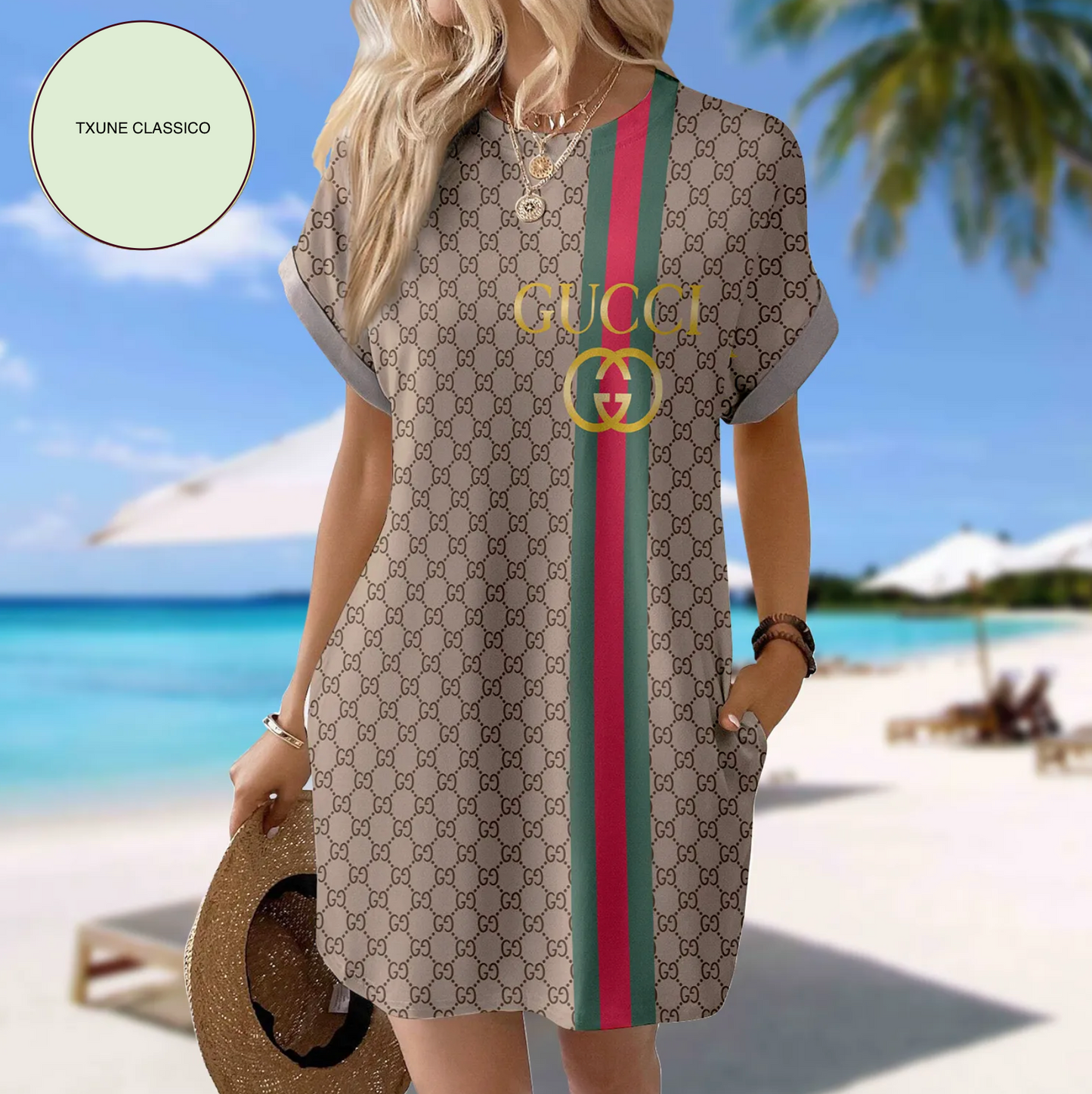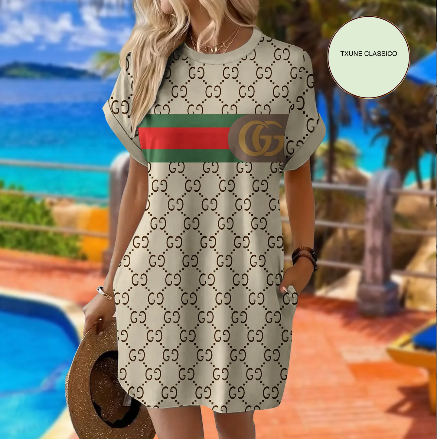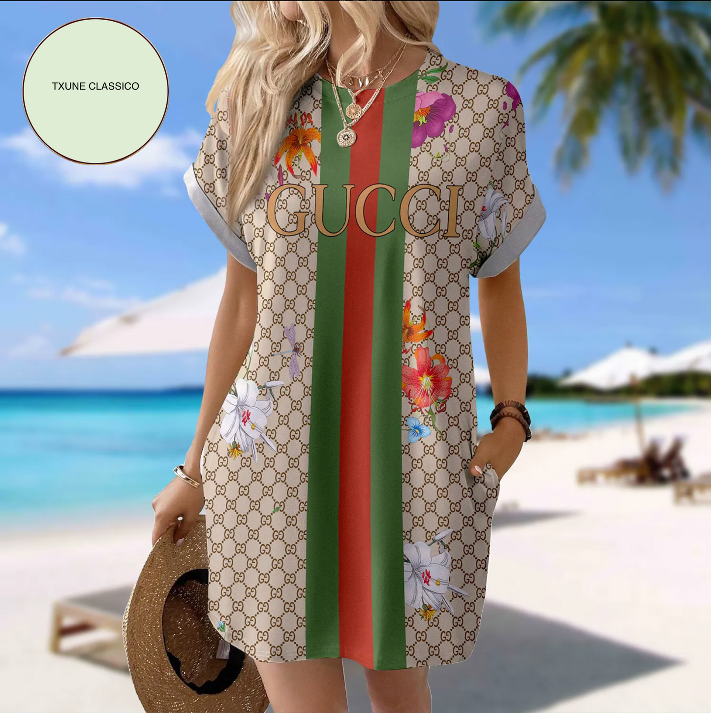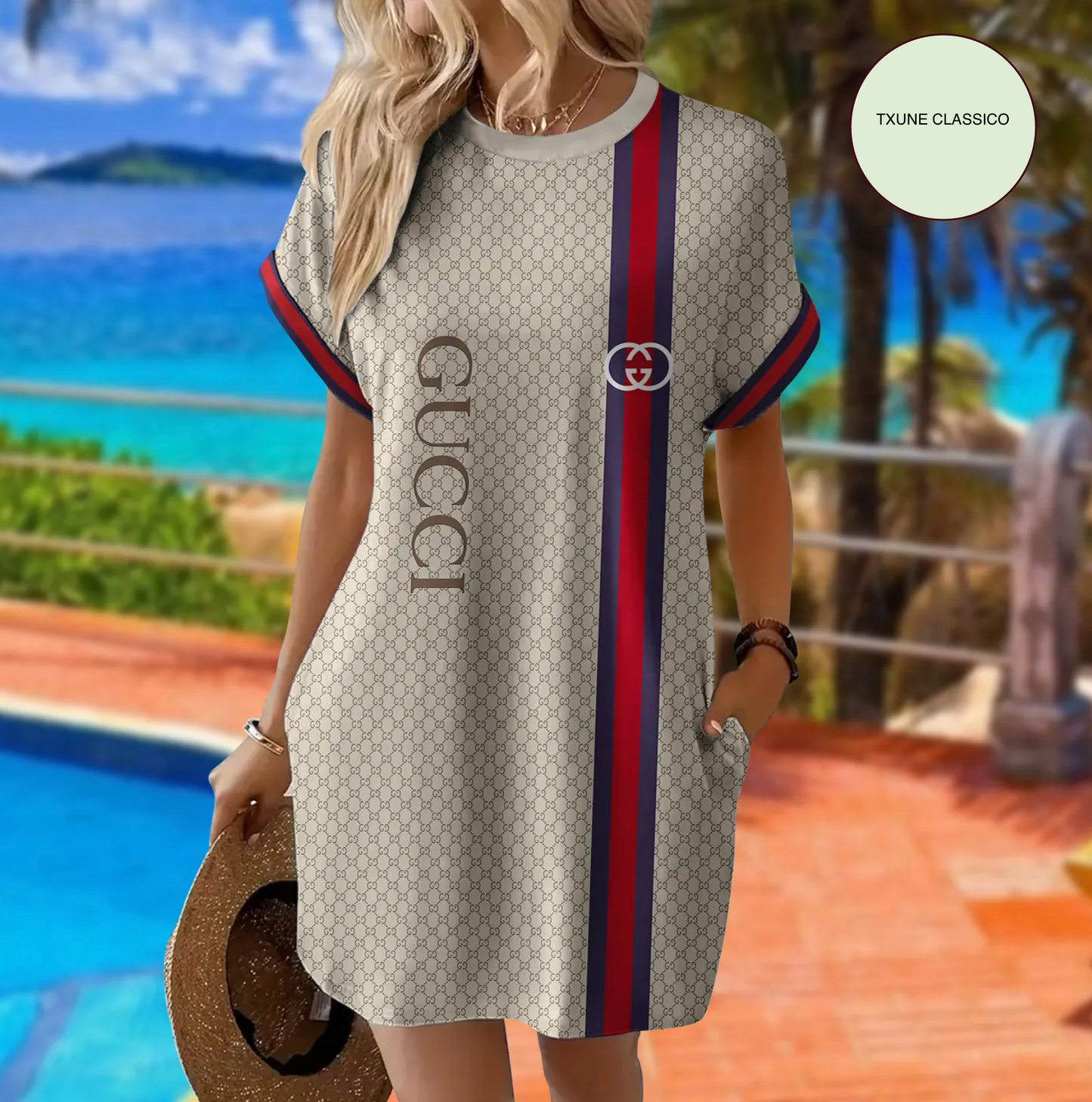 Olá, nosso contacto: 84-7374872; 84 382 205; 87 434 1611; Produto: Vestido com bolsos de Manga Curta GUCCI Material: 95% Poliéster, 5% Spandex Tamanhos: S, M, L, XL , XXL
