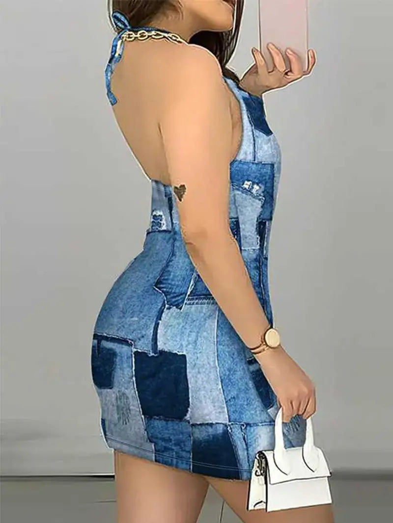 Vestido com estampa gráfica de retalhos, vestido bodycon sexy com decote halter