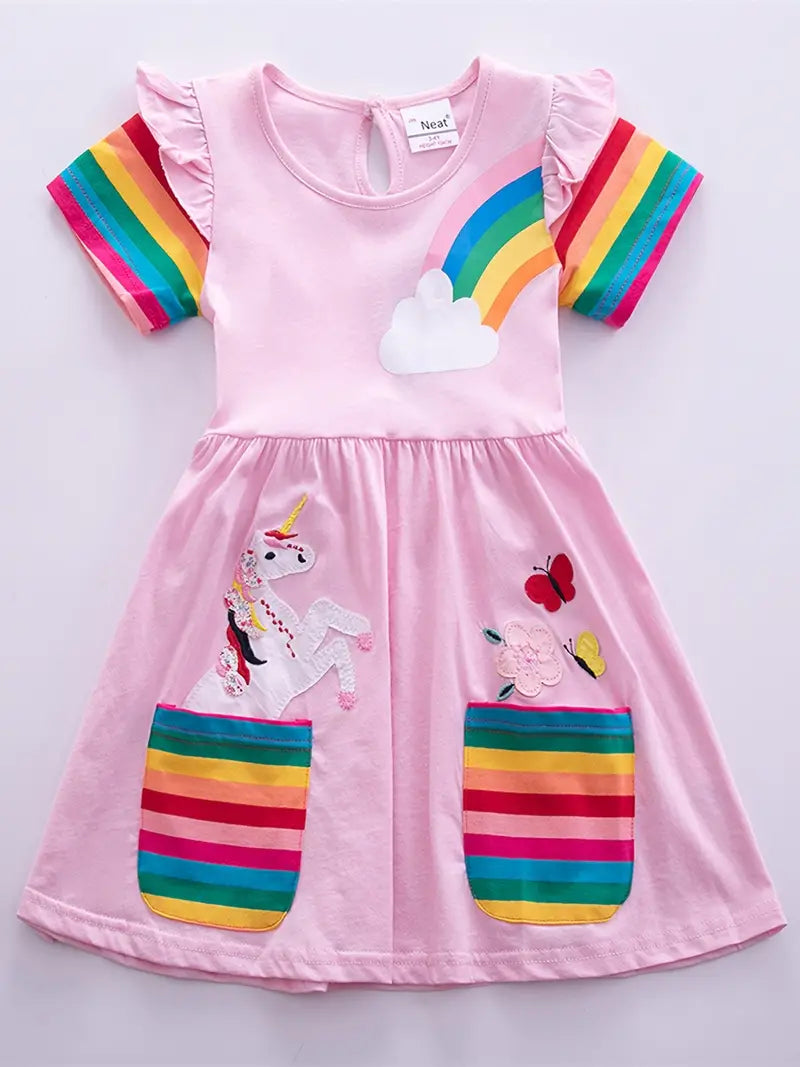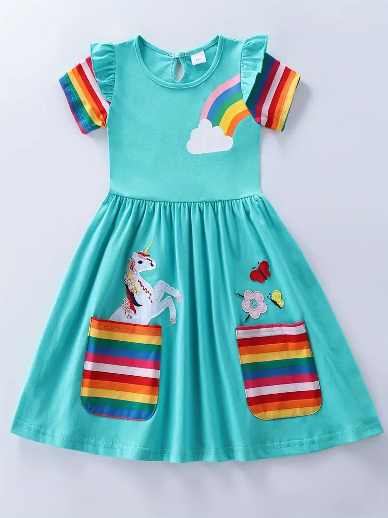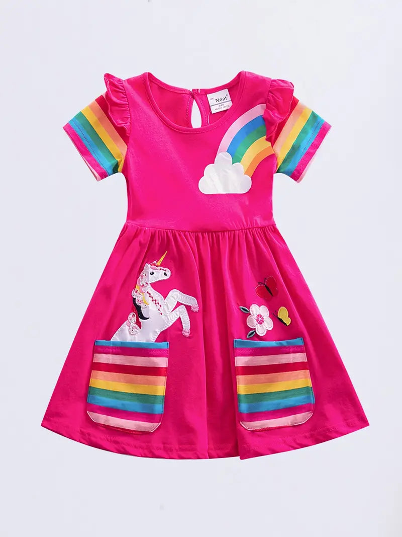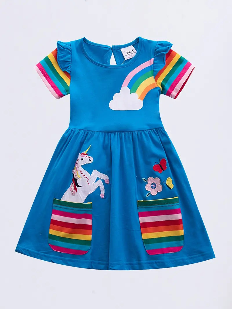 Vestido de algodão com babados de desenho animado com estampa de arco-íris de unicórnio
