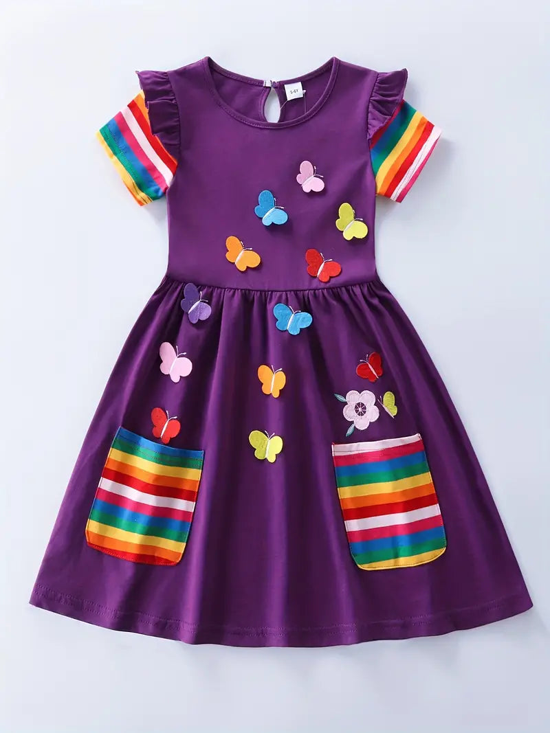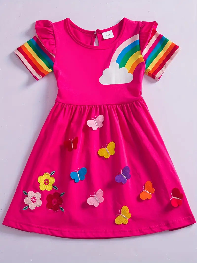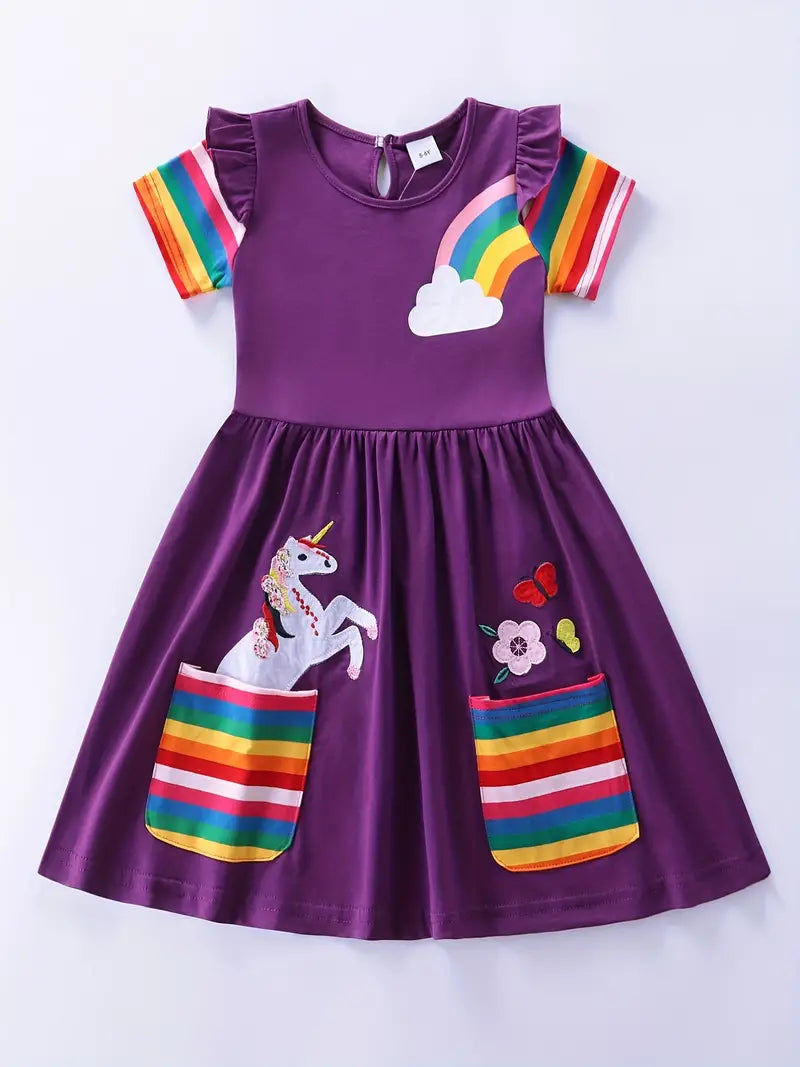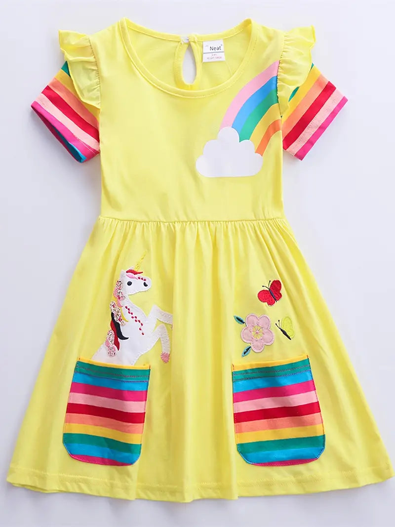 Vestido de algodão com babados de desenho animado com estampa de arco-íris de unicórnio