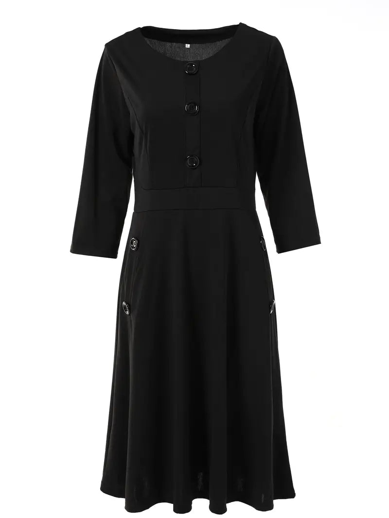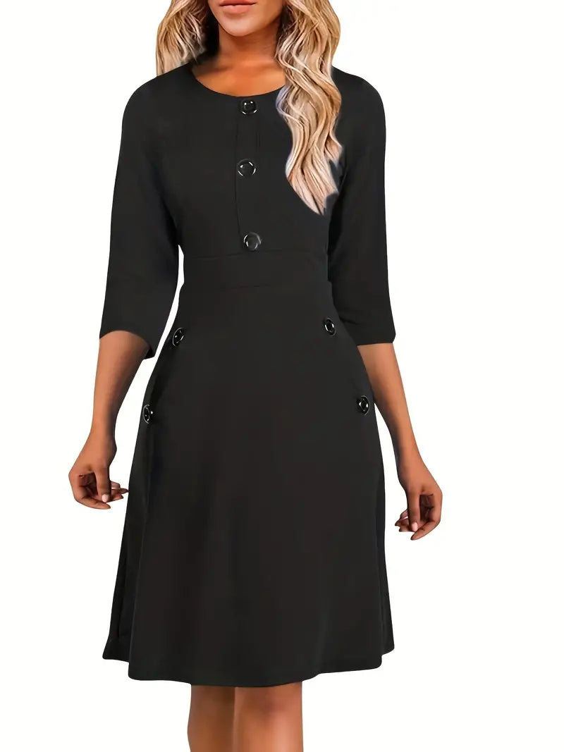 Vestido de botões sólidos, elegante gola redonda manga 3/4 vestido de cintura fina