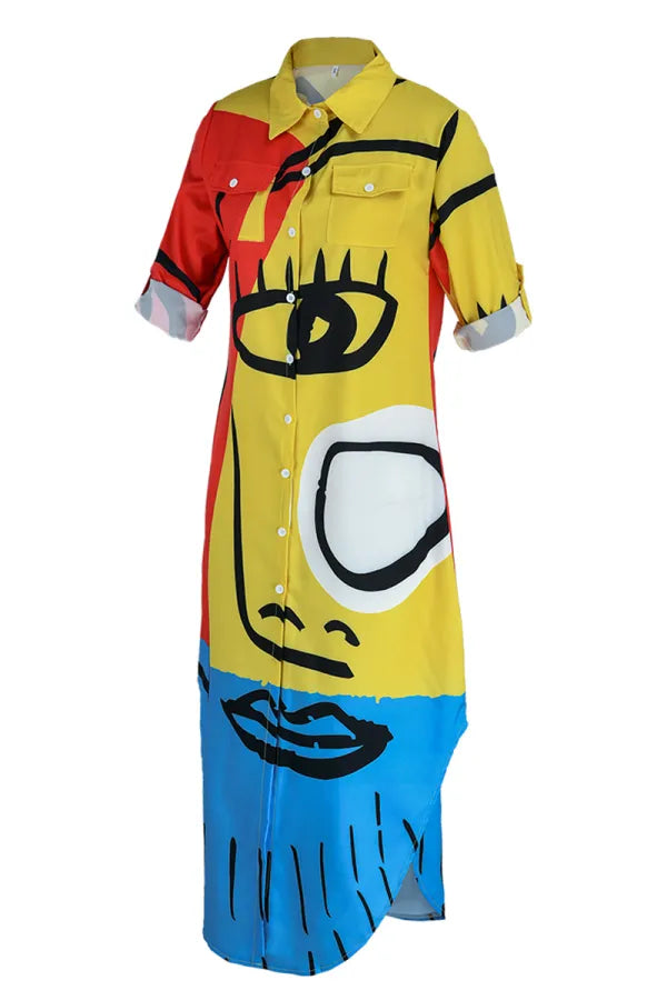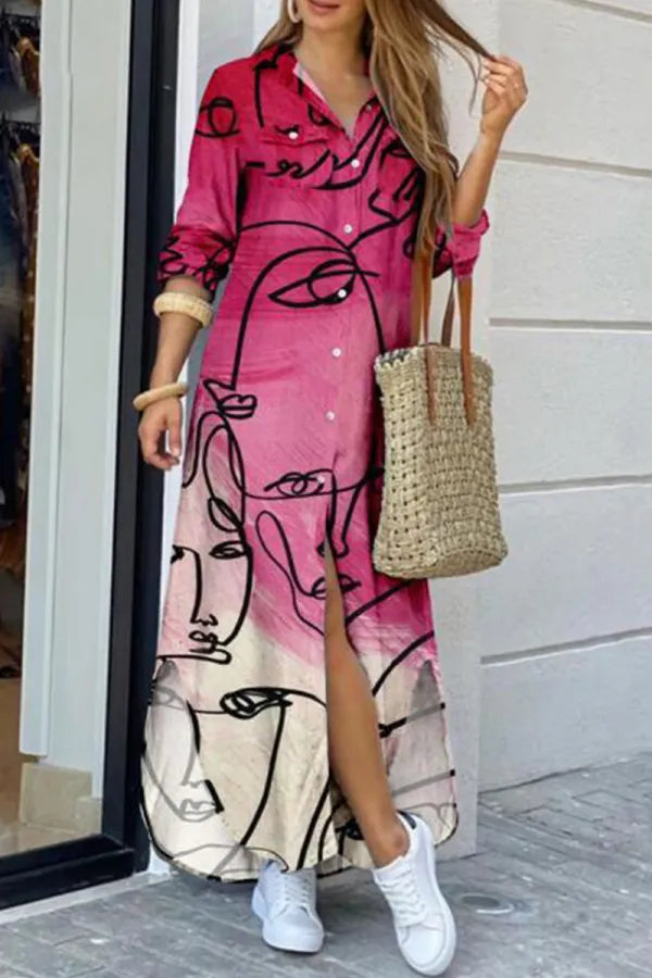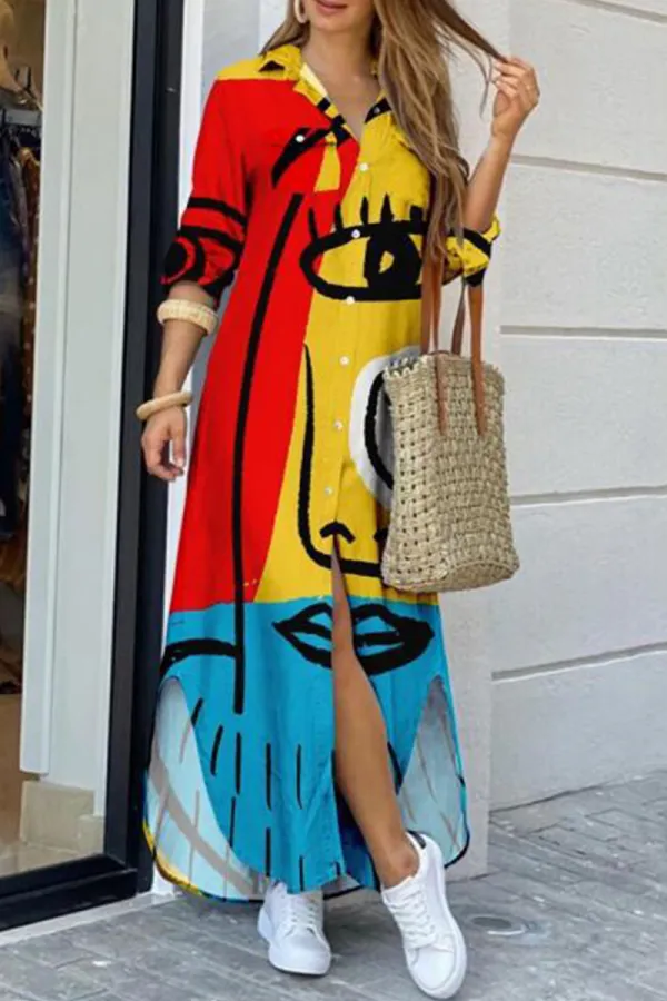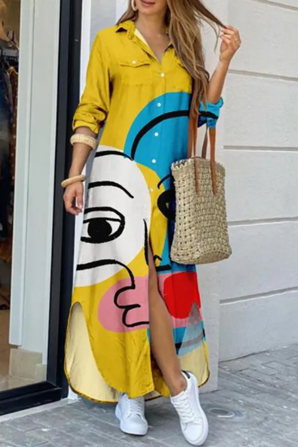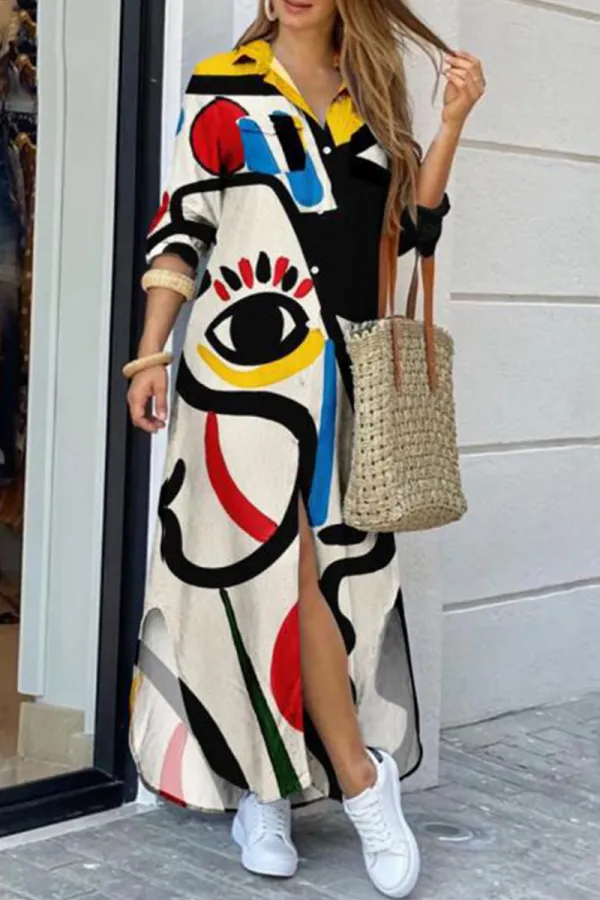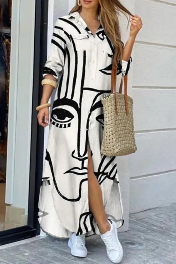 Vestido de camisa com estampa de moda e fenda na gola virada para baixo