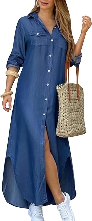 Produto: Vestido de camisa com estampa de moda e fenda na gola virada para baixo; Material: 100% Algodao