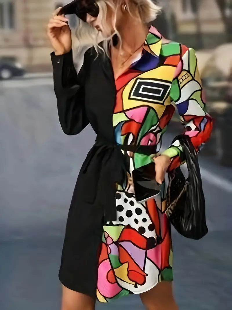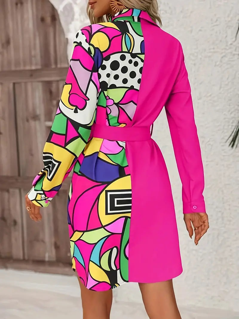 Vestido de emenda com estampa geométrica, vestido casual de manga comprida com botão frontal