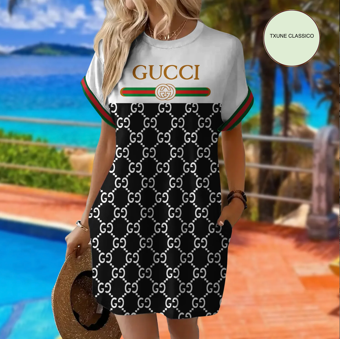 Olá, nosso contacto: 84-7374872; 84 382 205; 87 434 1611; Produto: Vestido de manga curta com bolsos GUCCI Material: 95% Poliéster, 5% Spandex Tamanhos: S, M, L, XL , XXL