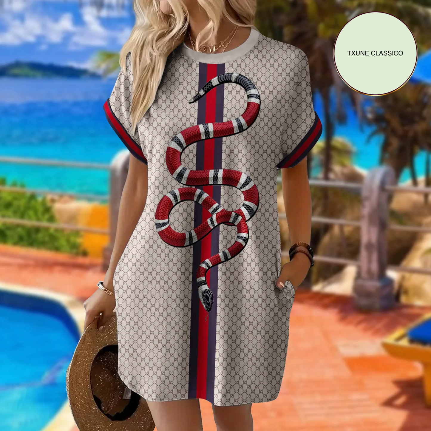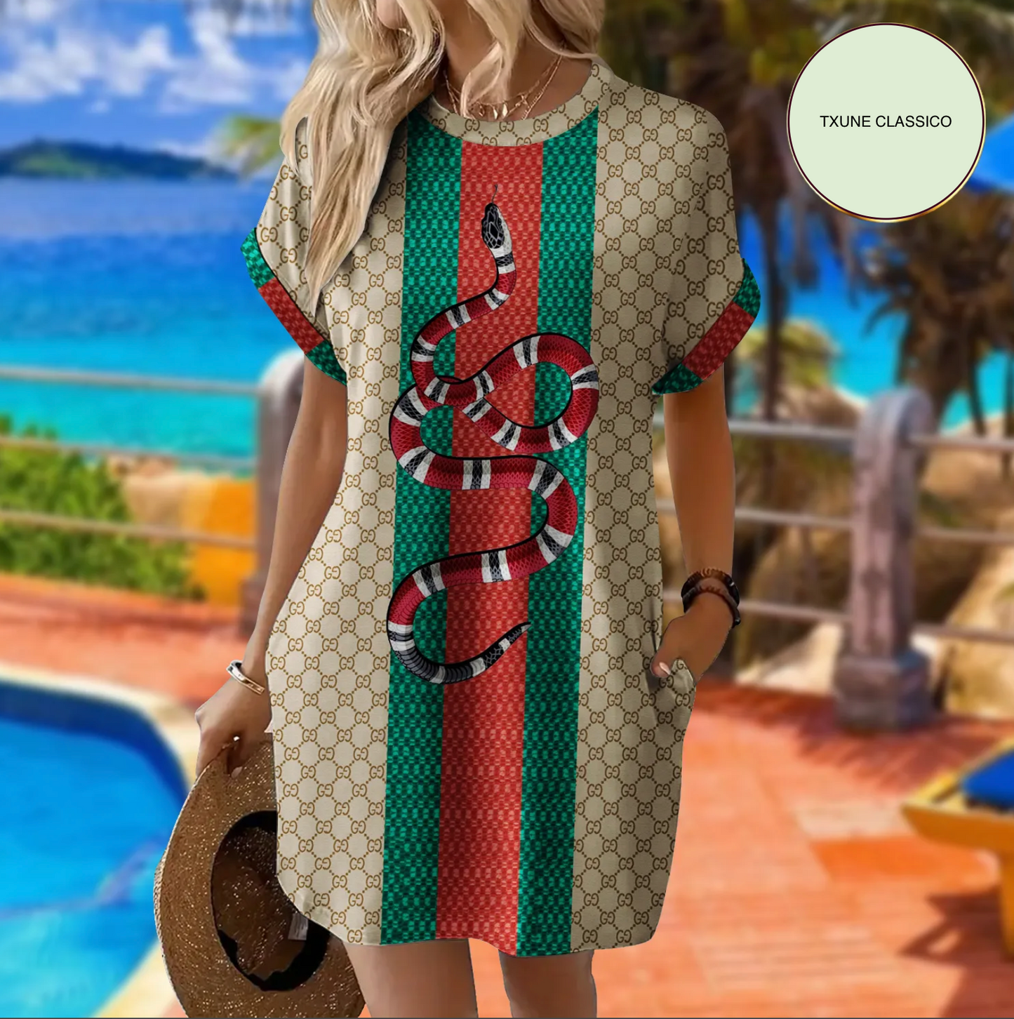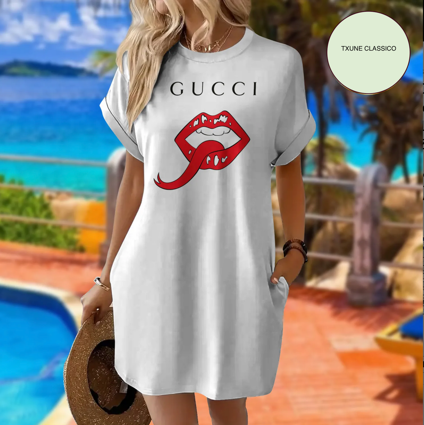 Olá, nosso contacto: 84-7374872; 84 382 205; 87 434 1611; Produto: Vestido de manga curta com bolsos GUCCI Material: 95% Poliéster, 5% Spandex Tamanhos: S, M, L, XL , XXL