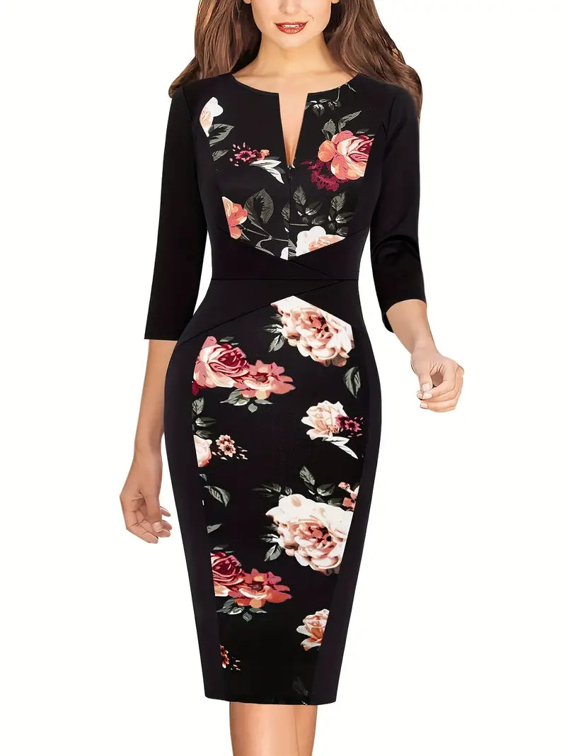 Vestido de manga três quartos com estampa abstrata, vestido lápis elegante com gola redonda