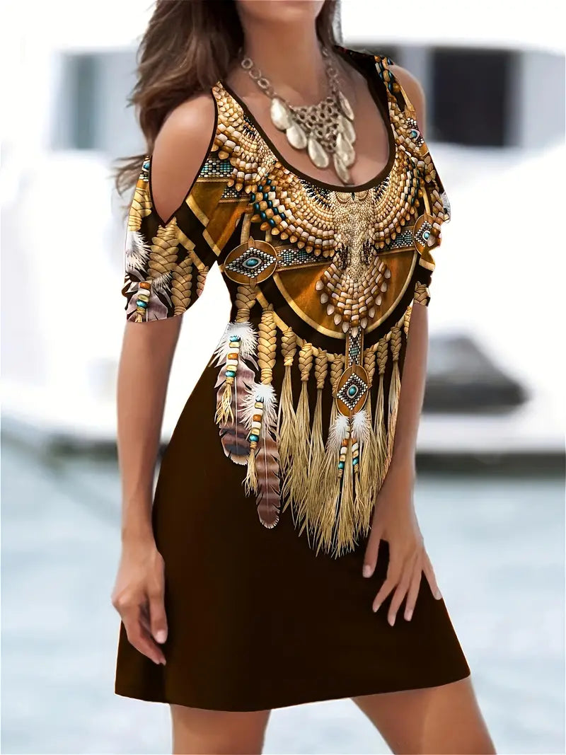 Vestido de ombro frio com estampa étnica, vestido vintage de manga curta com gola redonda