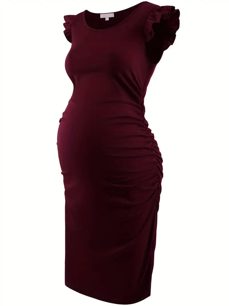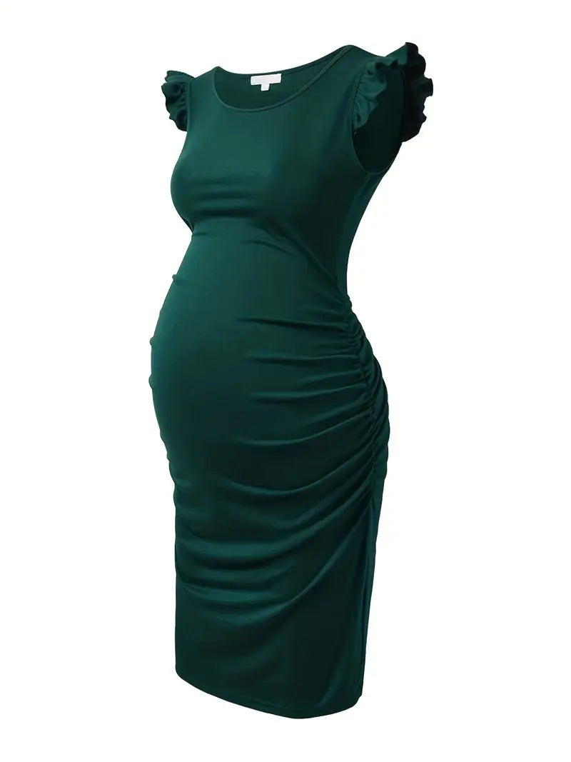 Vestido elegante e moderno com babados e manga franzida para gestantes