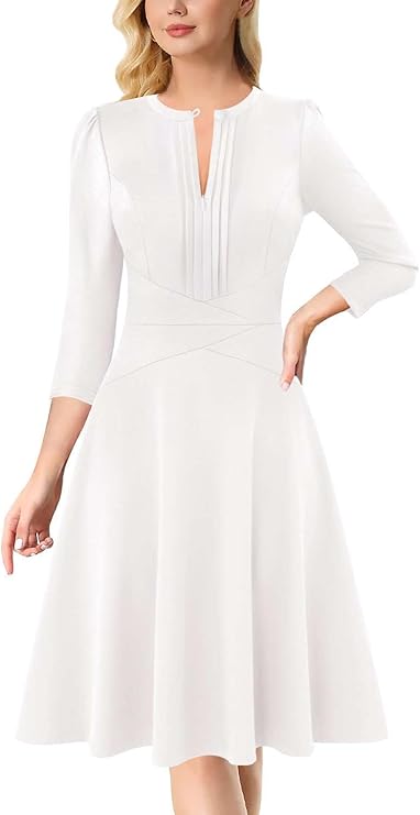Vestido plissado para mulher com decote redondo e fecho frontal, trabalho, escritório, negócios