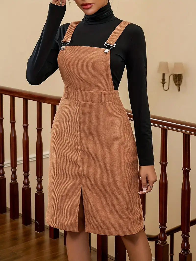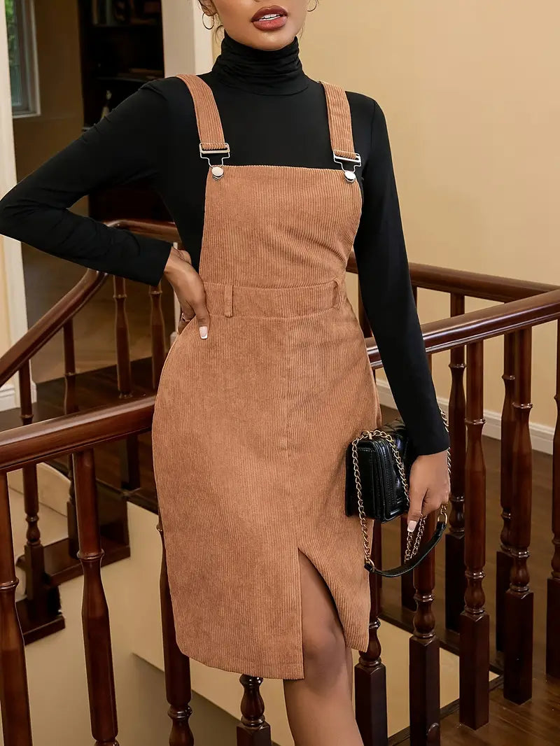 Vestido suspensor de veludo cotelê de cor sólida, vestido casual sem mangas com bainha dividida