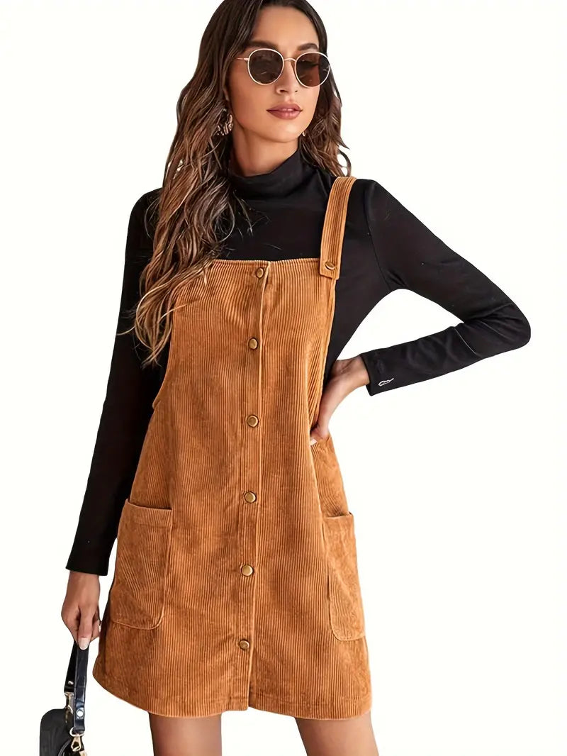 Vestido suspensório sólido com botão frontal, vestido casual sem mangas com bolsos