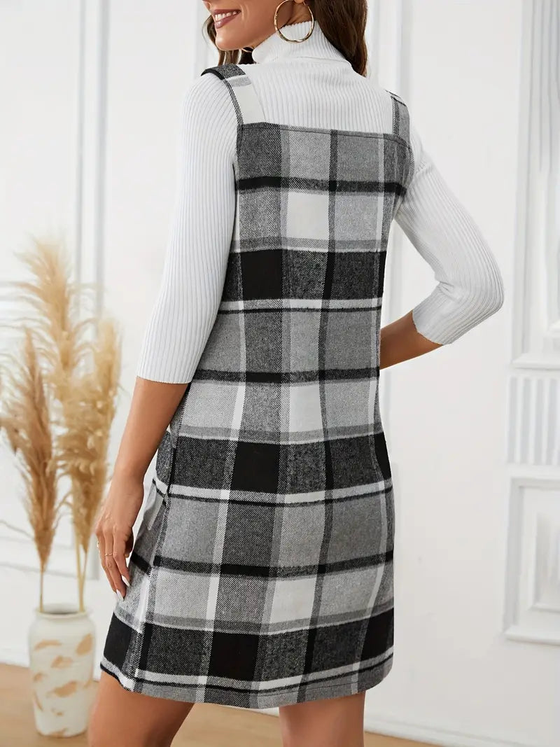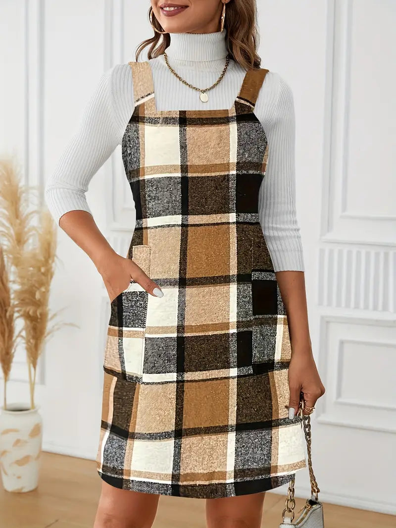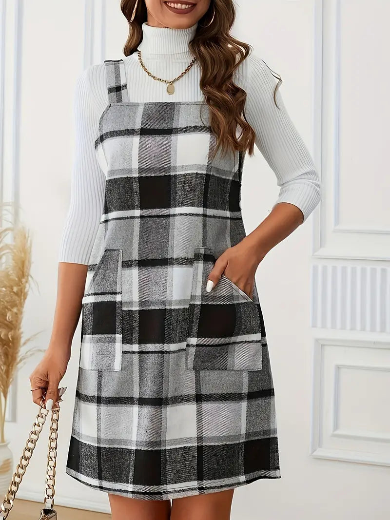 Vestido Suspensório xadrez padrão, vestido casual sem mangas com bolsos