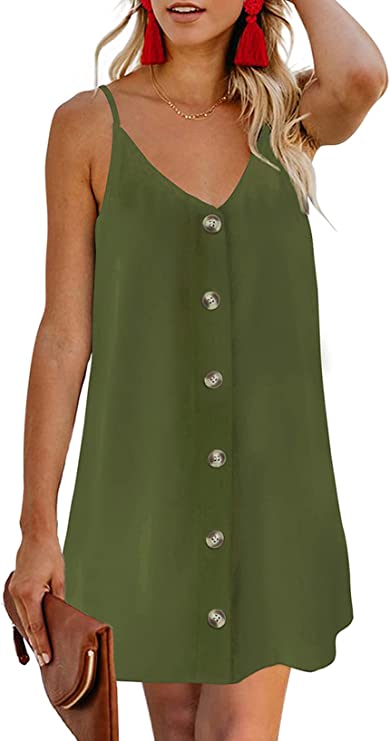 Vestidos femininos de verão com alça espaguete, botão, decote em V, sem mangas, casual